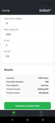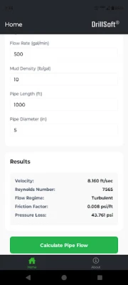 - Comprehensive Fluid Dynamics: Instantly calculate pipe and annular velocity, Reynolds number, flow regime, friction factor, and total pressure losses.