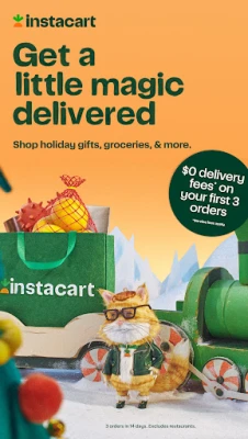 Get food delivery and grocery orders delivered directly to your door in as fast as 30 minutes with our app that helps with your shopping. Let Instacart connect you to your favorite food & drink spots, local grocery store or chain and get your goods in no time. Browse, shop, and eat with convenient grocery delivery in just a few taps! Plus, enjoy $0 delivery fee on your first three grocery orders within 14 days of the first order. Service fees, exclusions, and terms apply!