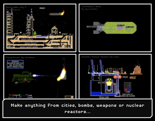 The Powder Toy is a free physics sandbox game, which simulates air pressure and velocity, heat, gravity and a countless number of interactions between different substances! The game provides you with various building materials, liquids, gases and electronic components which can be used to construct complex machines, guns, bombs, realistic terrains and almost anything else. You can then destroy them and watch cool explosions, add intricate wirings, play with little stickmen or operate your machine. You can browse and play thousands of different saves made by the community or upload your own – we welcome your creations!