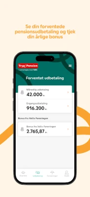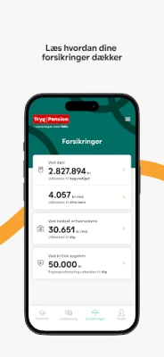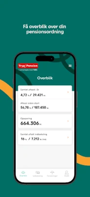 App'en giver dig et overblik over din pensionsordning hos Tryg Pension i samarbejde med Velliv: - Du kan holde sig ajour med udviklingen i din opsparing og se, hvad du kan forvente at få udbetalt fra Velliv, når du går på pension. - Du kan følge afkastet på dine investeringer og se din aftalte indbetaling i app’en. - Du kan få et overblik over dine forsikringer ved dødsfald, kritisk sygdom og invaliditet.